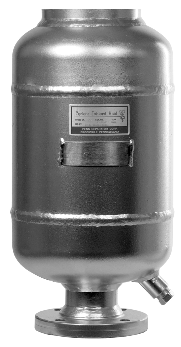 Water and Oil entrained in Exhaust Steam and Gases may cause damage to roofs and sidewalls and unsightly icing and dirt accumulation. The spiral baffles swirl the steam or exhaust gases and the resulting CYCLONIC ACTION throws the entrained water, oil and dirt to the outside of the cyclone where it is directed to the exhaust head drain.